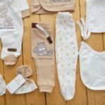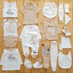 تکه ها شامل :سرهمی جورابدار، بلوز جلودکمه، شلوار معمولی، شلوار جوراب دار، بادی استین کوتاه، بلوز آستین کوتاه ، بلوز آستین بلند، رکابی ، ناف بند، یک جفت جوراب، یک جفت دستکش، کلاه بندی، کلاه گرد، شورت عینکی، پیشبند، روسری، دستمال