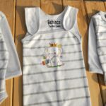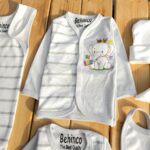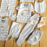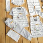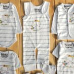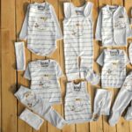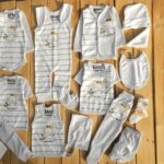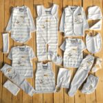 تکه ها شامل : سرهمی بیلری، بلوزجلودکمه، زیردکمه استین بلند، بلوز استین کوتاه 2 عدد ، رکابی، شلوار معمولی، شلوار جوراب دار، پارچه قنداق، دستکش، پاپوش، کلاه بندی، پیشبند، شورت عینکی ، روسری و دستمال کلاه گرد