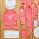 تکه ها شامل : بلوز جلودکمه، زیردکمه استین کوتاه، بلوز استین کوتاه، رکابی،بلوز استین بلند، شلوار معمولی، شلوار جوراب دار، پارچه قنداق پیچ و بند، ناف بند، دستکش، پاپوش، کلاه بندی، پیشبند، شورت عینکی ، روسری و دستمال