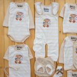 تکه ها شامل : سرهمی بیلری، بلوزجلودکمه، زیردکمه استین بلند، بلوز استین کوتاه 2 عدد ، رکابی، شلوار معمولی، شلوار جوراب دار، پارچه قنداق، دستکش، پاپوش، کلاه بندی، پیشبند، شورت عینکی ، روسری و دستمال کلاه گرد