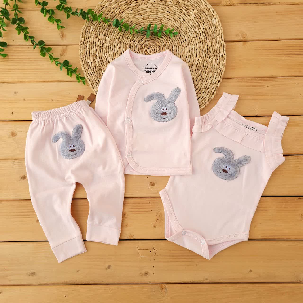 ست لباس 3 تکه دورو پنبه خالص خرگوش صورتی نینینو