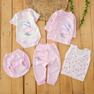 ست لباس 5تکه پنبه طرح گربه و ابر صورتی لیونا